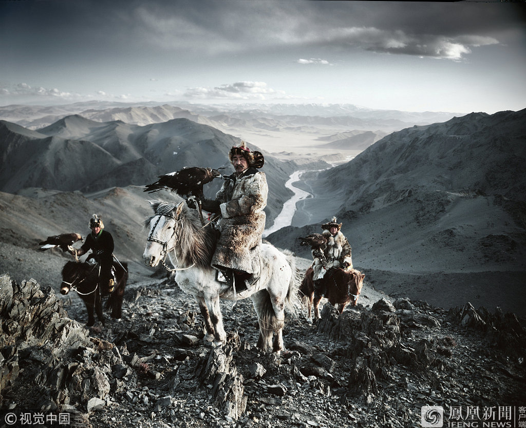 哈萨克族的成员们骑在马背之上,背后是蒙古茫茫荒野,手上是正欲展翅的雄鹰。从很小的时候起,他们就学会了骑马,并且懂得利用老鹰来狩猎和侦察。