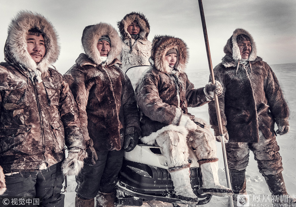 西伯利亚的多尔干人(Dolgan people)站在北极冻原上。一名男性手持长矛坐在雪橇前。他们用驯鹿来搬运重物,却抛弃了古老的传统,改用现代步枪进行狩猎。