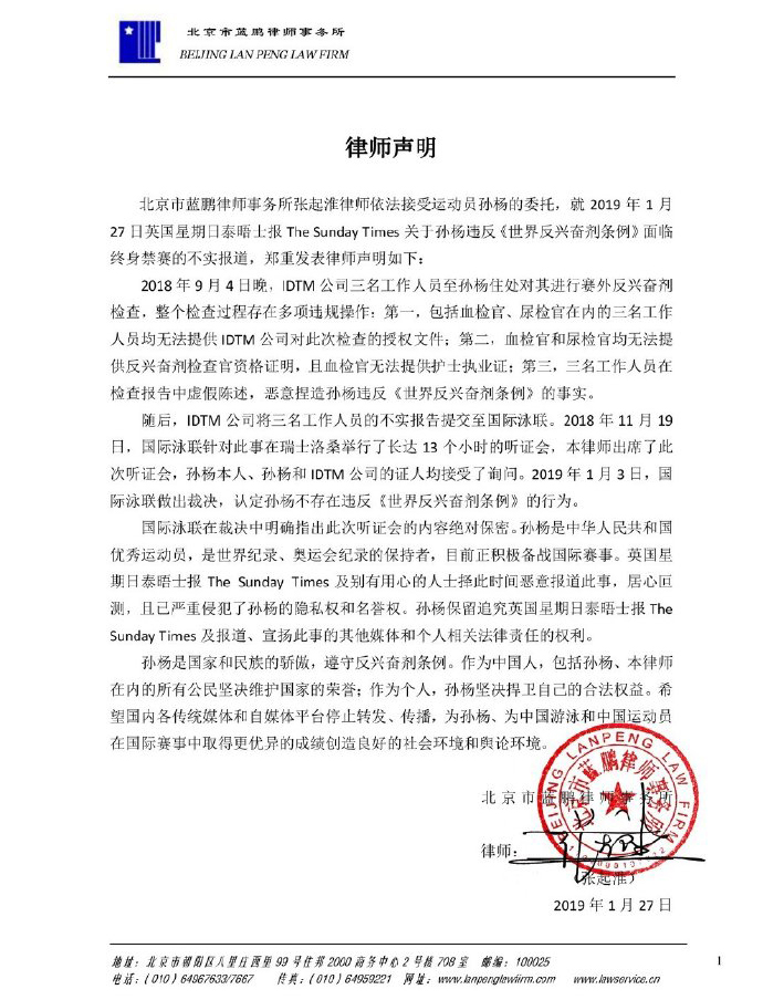 律师声明,北京市蓝鹏律师事务所张起淮律师依法接受运动员孙杨的委托,就2019年1月27日英国星期日泰晤士报The Sunday Times关于孙杨违反《世界反兴奋剂条例》面临终身禁赛的不实报道,郑重发表律师声明如下:2018年9月4日晚,IDTM公司三名工作人员至孙杨住处对其进行赛外反兴奋剂检查,整个检查过程存在多项违规操作:第一,包括血检官、尿检官在内的三名工作人员均无法提供IDTM公司对此次检查的授权文件;第二,血检官和尿检官均无法提供反兴奋剂检查官资格证明,且血检官无法提供护士执业证;第三,三名工作人员在检查报告中虚假陈述,恶意捏造孙杨违反《世界反兴奋剂条例》的事实。随后,IDTM公司将三名工作人员的不实报告提交至国际泳联。2018年11月19日,国际泳联针对此事在瑞士洛桑举行了长达13个小时的听证会,本律师出席了此次听证会,孙杨本人、孙杨和IDTM公司的证人均接受了询问。2019年1月3日,国际泳联做出裁决,认定孙杨不存在违反《世界反兴奋剂条例》的行为。国际泳联在裁决中明确指出此次听证会的内容绝对保密。孙杨是中华人民共和国优秀运动员,是世界纪录、奥运会纪录的保持者,目前正积极备战国际赛事。英国星期日泰晤士报The Sunday Times及别有用心的人士择此时间恶意报道此事,居心叵测,且已严重侵犯了孙杨的隐私权和名誉权。孙杨保留追究英国星期日泰晤士报The Sunday Times及报道、宣扬此事的其他媒体和个人相关法律责任的权利。孙杨是国家和民族的骄傲,遵守反兴奋剂条例。作为中国人,包括孙杨、本律师在内的所有公民坚决维护国家的荣誉;作为个人,孙杨坚决捍卫自己的合法权益。希望国内各传统媒体和自媒体平台停止转发、传播,为孙杨、为中国游泳和中国运动员在国际赛事中取得更优异的成绩创造良好的社会环境和舆论环境。北京市蓝鹏律师事务所,律师:张起淮,2019年1月27日。