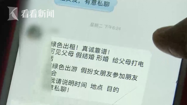 对于大龄单身男女青年来说,过年回家最害怕的,可能是来自亲戚朋友“直击灵魂”的三连问:有没有对象?怎么还不找?什么时候找?在此背景下,租借男女朋友回家过年的市场,就应运而生了。调查发现,租借市场不仅行情火爆,甚至还有藏污纳垢的嫌疑。
