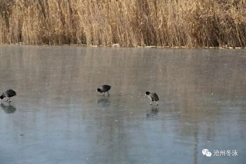 2018年入冬后,几只野生骨顶鸡迁徙光临栖息我们冬泳基地。我们亲切地称呼他们为“小鸭子”。它们完全放弃了对我们的戒备,主动接近我们,与我们共同在冰窟中畅游。我们得到了大自然的依赖和认可,这是何等的默契与和谐!