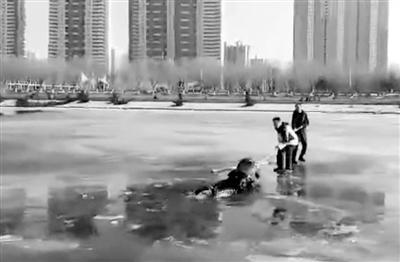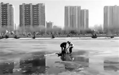 不多一会儿,对岸传来了连续的呼救声:“救命啊!救命!”杜懿哲和伙伴们向对面一看,靠近南岸的冰面上开了一个大洞,隐约看见一名男子正在里面扑腾。“有人落水了!”杜懿哲立即从岸边找来木棍,和几个朋友从冰面上赶了过去。