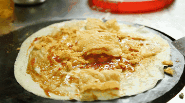 做法 绿豆面摊饼,加鸡蛋、果篦儿,涂上面酱、辣酱卷起即可