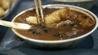 肉汤里的油脂浸湿了年糕团中饱满的馅料,最好连油条也要先在肉汤里浸一浸,这样一口下去才叫满足感爆棚。