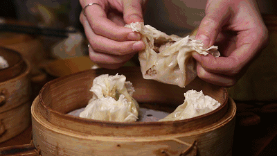 带着汤汁的小笼包,第一步不能急着入口,一定要先戳破了吸吮些汤汁才行。要是不习惯吃小笼包的人,往往闹出笑话。