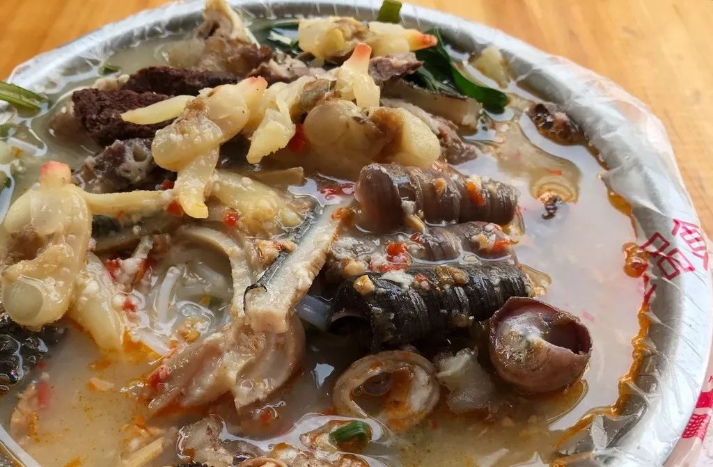 将酿酒后剩下的酒糟里佐入辣椒、蒜米、香油等,熬出酸辣开胃的汤底,尚未入口便已分泌了满嘴的口水。大厨熟练地在碗里甩一把海菜、几颗海螺、几团石葱、一些牛杂,最后淋上几大勺热辣酸香的汤底,一碗正宗的铺前糟粕醋便正式出炉。