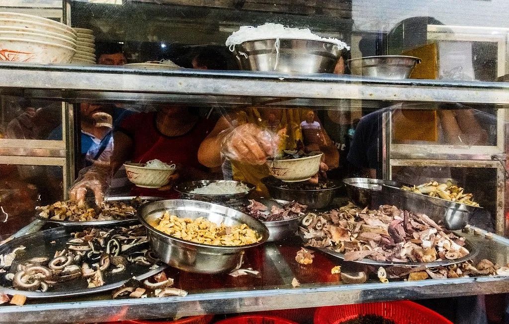 在铺前镇胜利街古老的骑楼巷中穿行,通常都不会错过“阿妹糟粕醋”,走进去不久便能看见硕大的红色招牌,简单又醒目。店门口一个四五层高的玻璃柜最引人注目,橱柜里依次摆放着大螃蟹、蚵类、粉肠、海带、石葱、脆骨等,即便隔着朦胧的玻璃窗,也挡不住新鲜食材的魅力。店内不断窜出糟粕醋汤底的香味,化作空气里一只无形之手,“勾引”着路人马上想钻进铺子来上一碗。