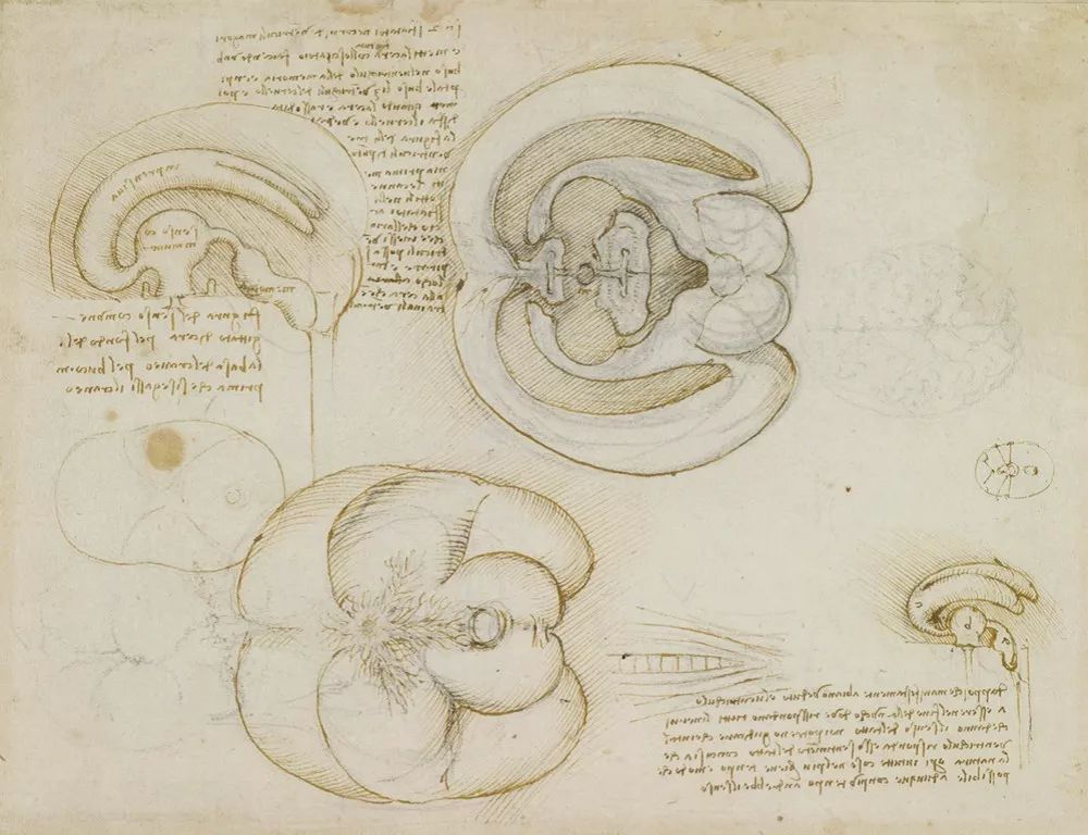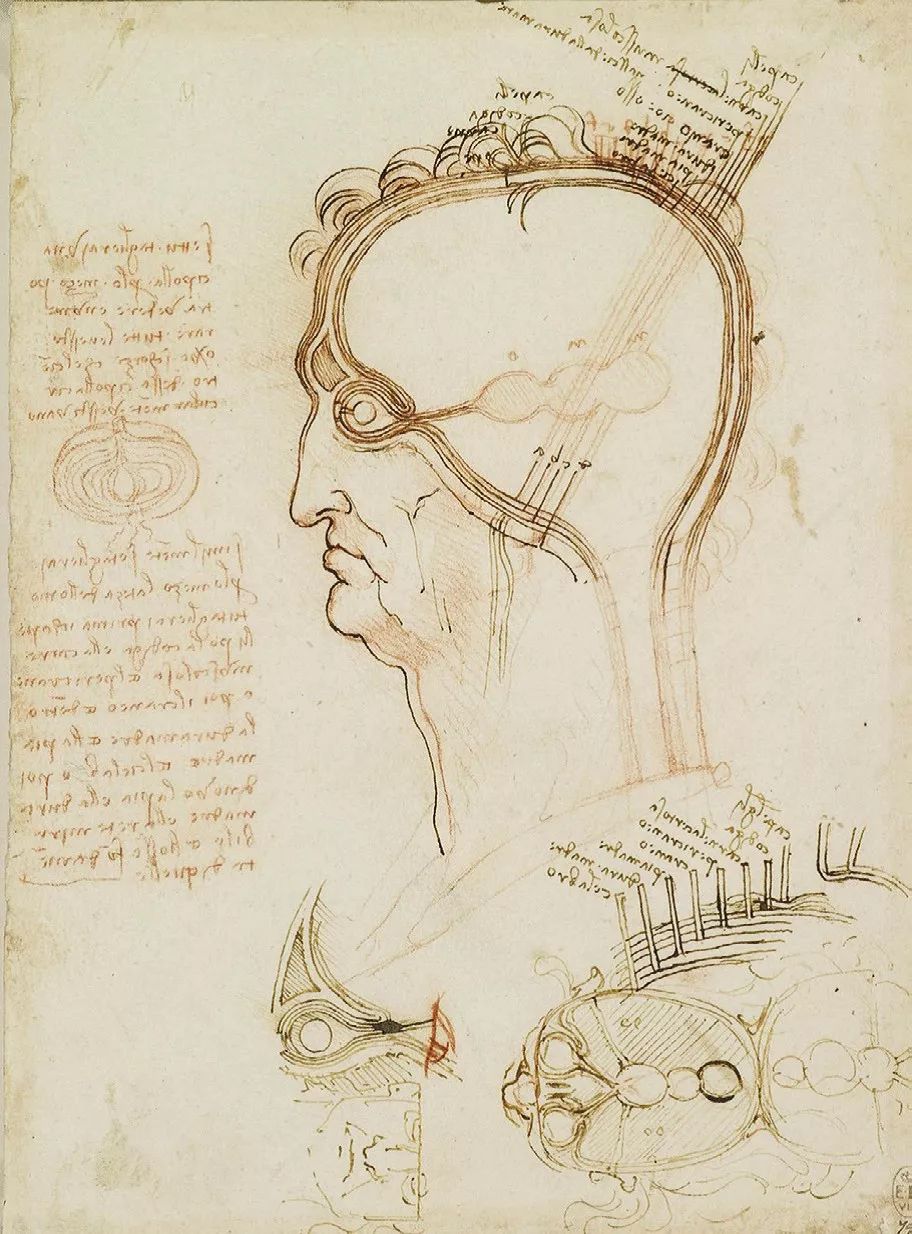 达芬奇关于脑室的绘图反映了他对大脑的认识。他写道,如果把洋葱从中间切开,可以看到环绕洋葱中心的所有外皮;相似地,如果从一个人头的中间切开,将依次切过头、肌肉、颅骨和头盖骨,在内部,则是硬膜、软膜和大脑。