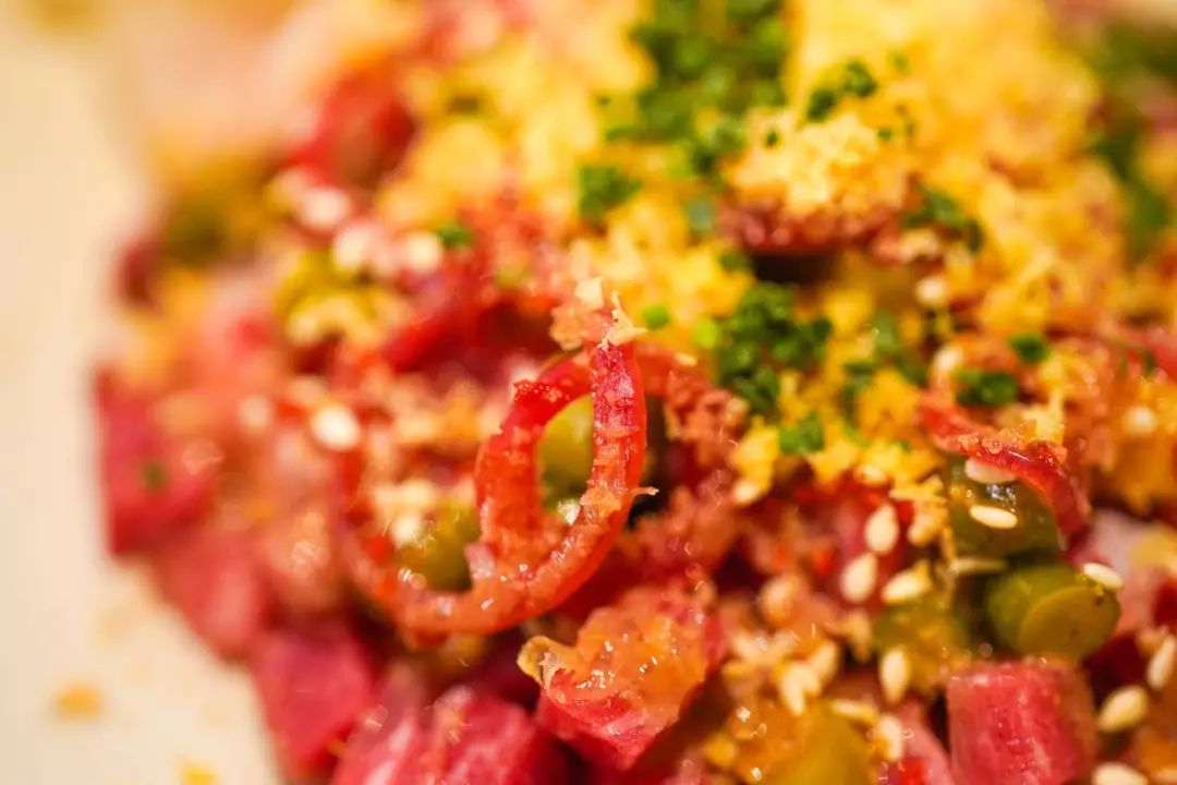 主厨说,厨房里有很多泡菜坛子,提供多种家乡泡菜。比如生牛肉塔塔里,有泡菜蒜苗丁,又酸又脆又多汁: