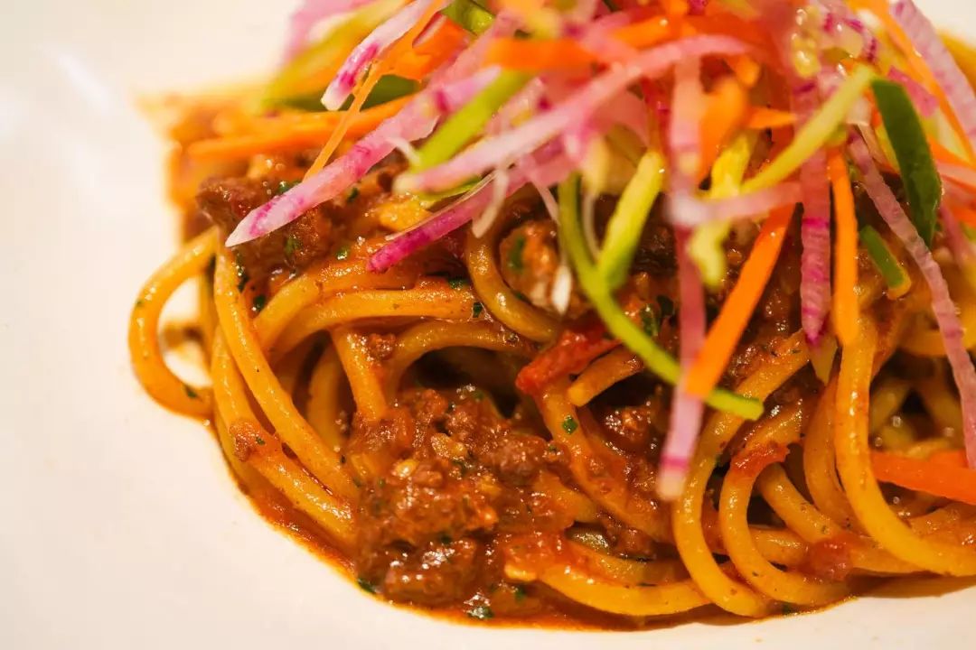 鸭肉「炸酱面」配豆瓣酱、黑蒜、新鲜手撕马苏里拉芝士,和烤章鱼配三重泡菜。