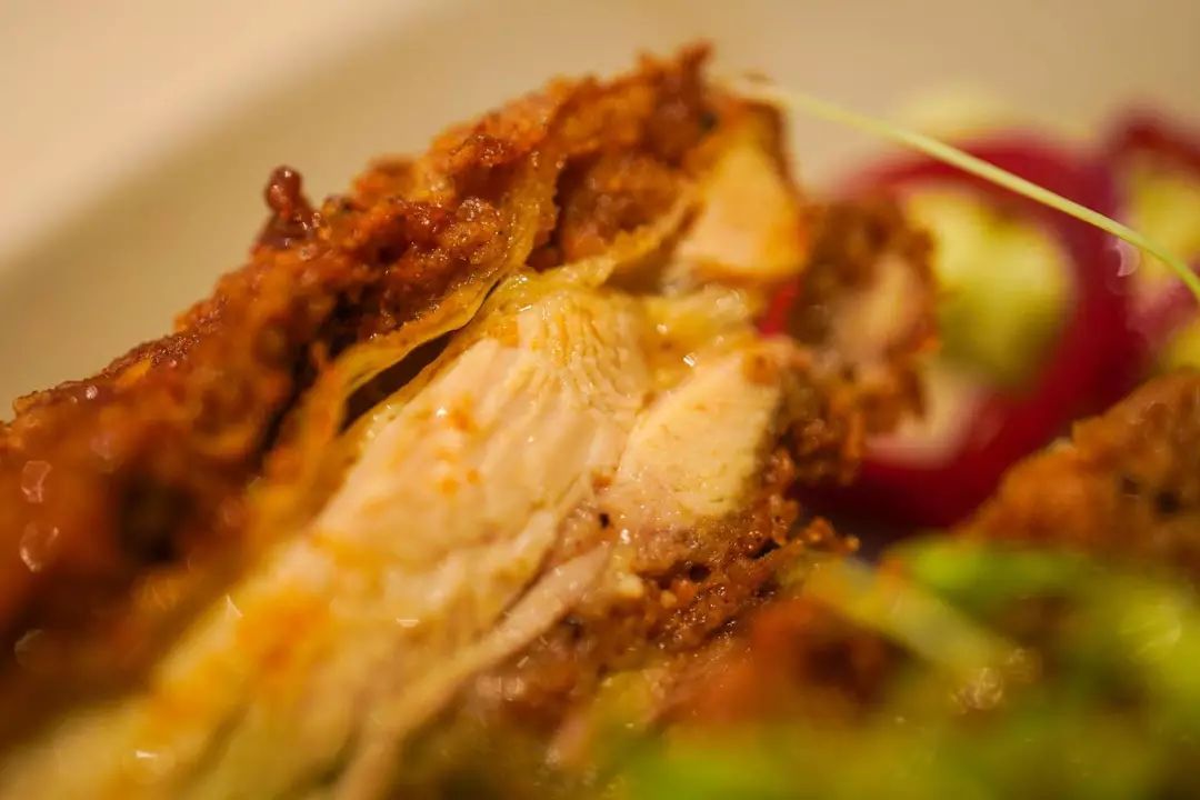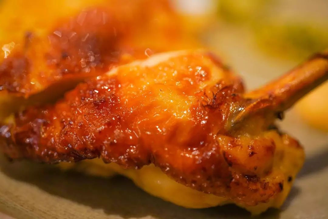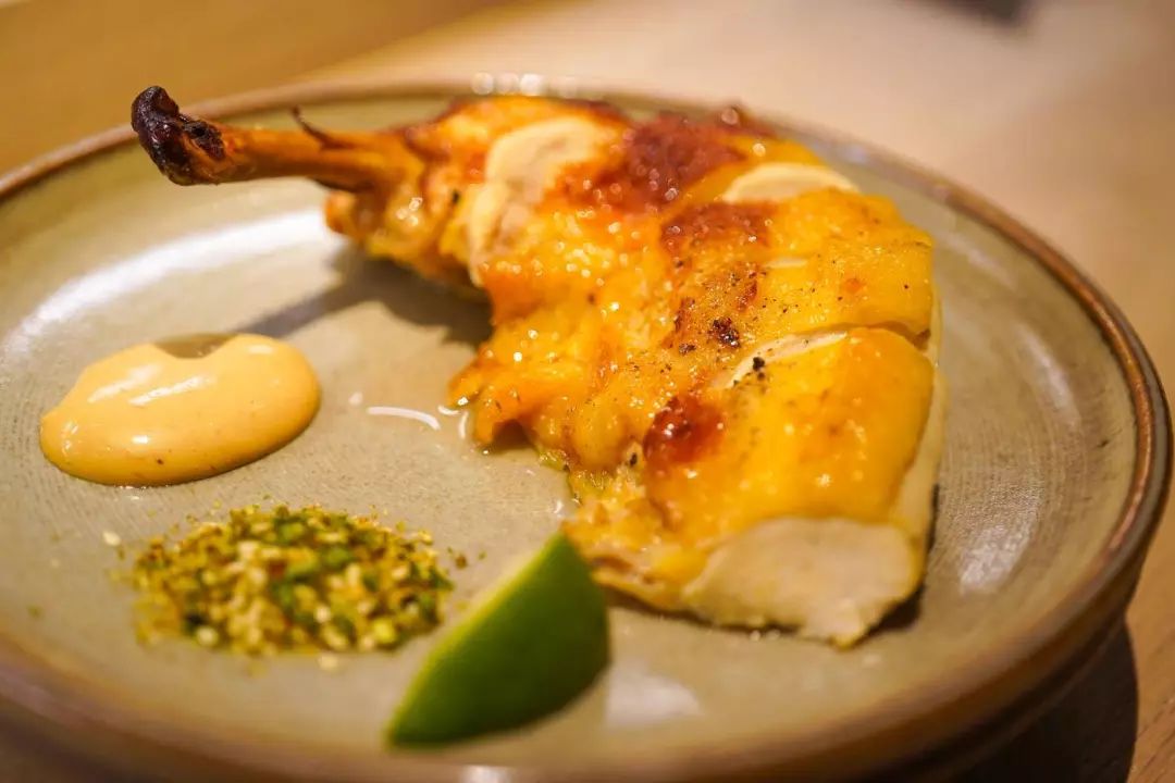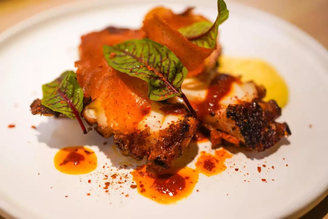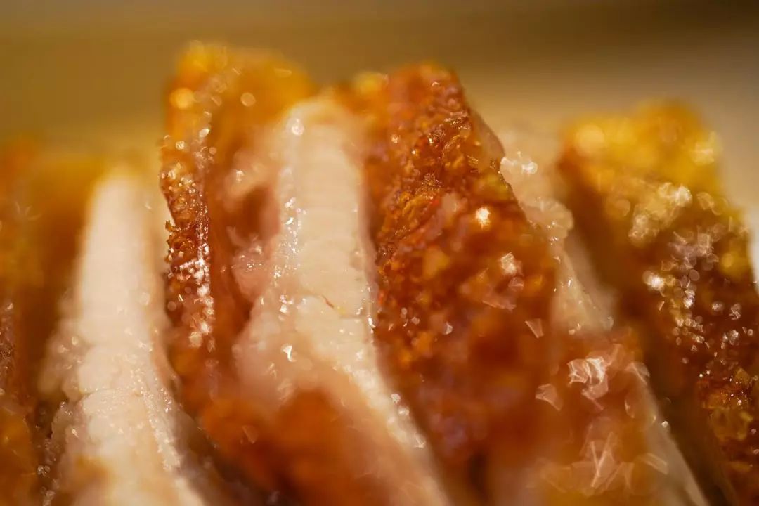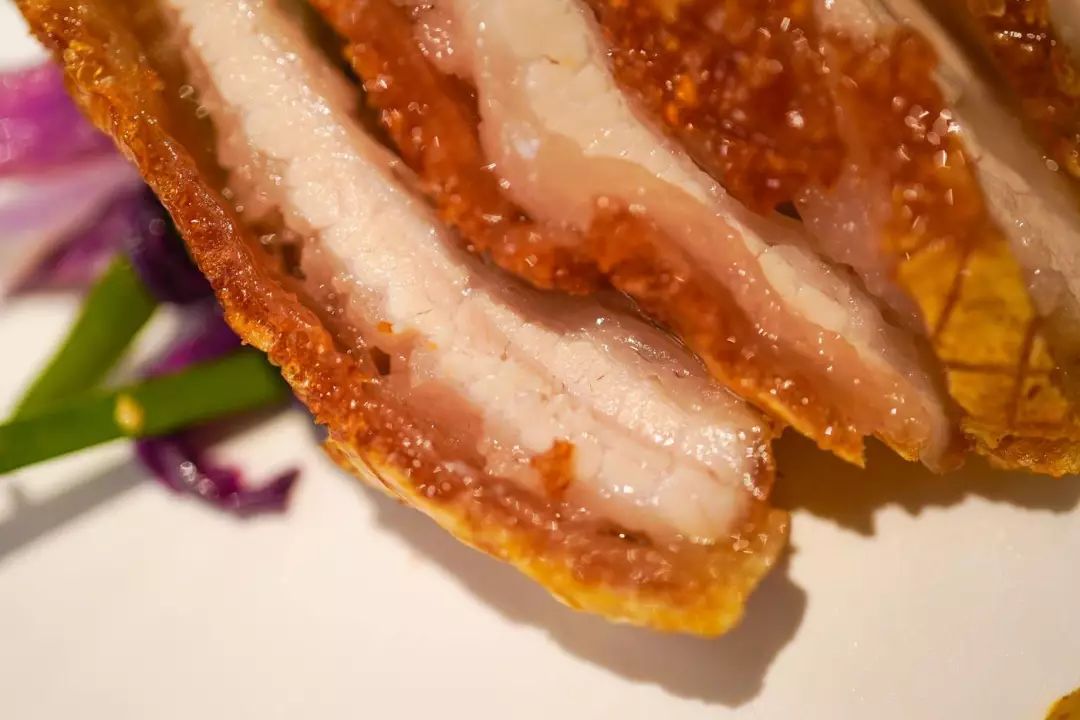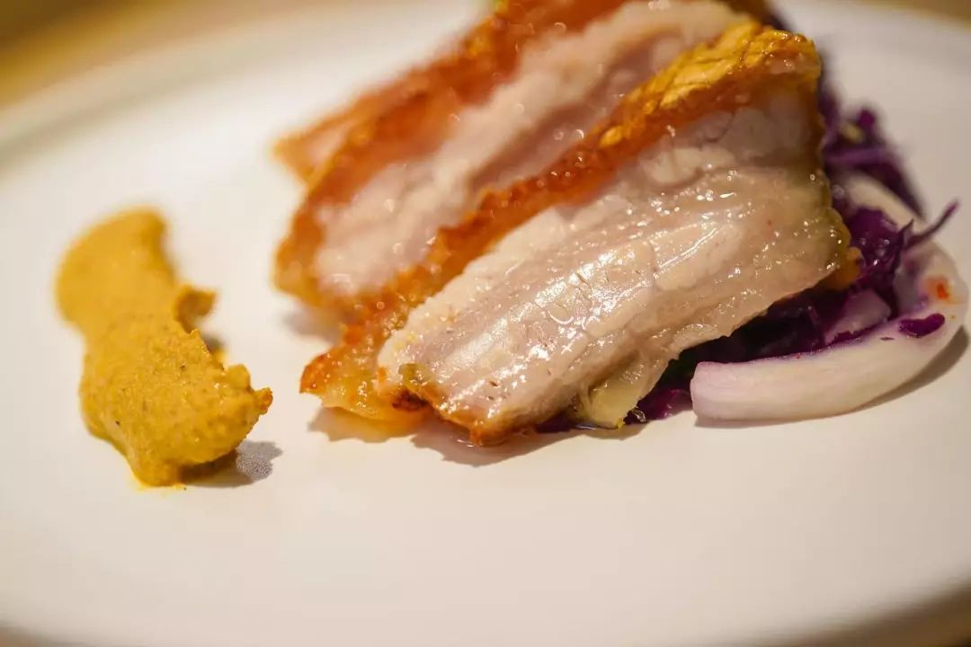 主厨的新鲜玩法还有很多。比如这个脆皮五花肉,皮极脆而滚烫,肉极嫩且多汁,配的黄芥末酱沁凉又辛辣: