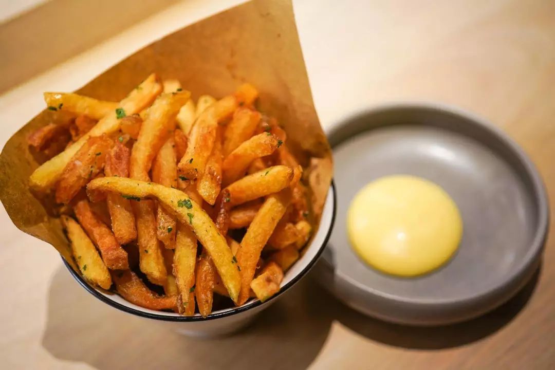 茶熏三黄鸡胸配XO 蛋黄酱、调味芝麻盐和牛油薯条配藏红花蛋黄酱。