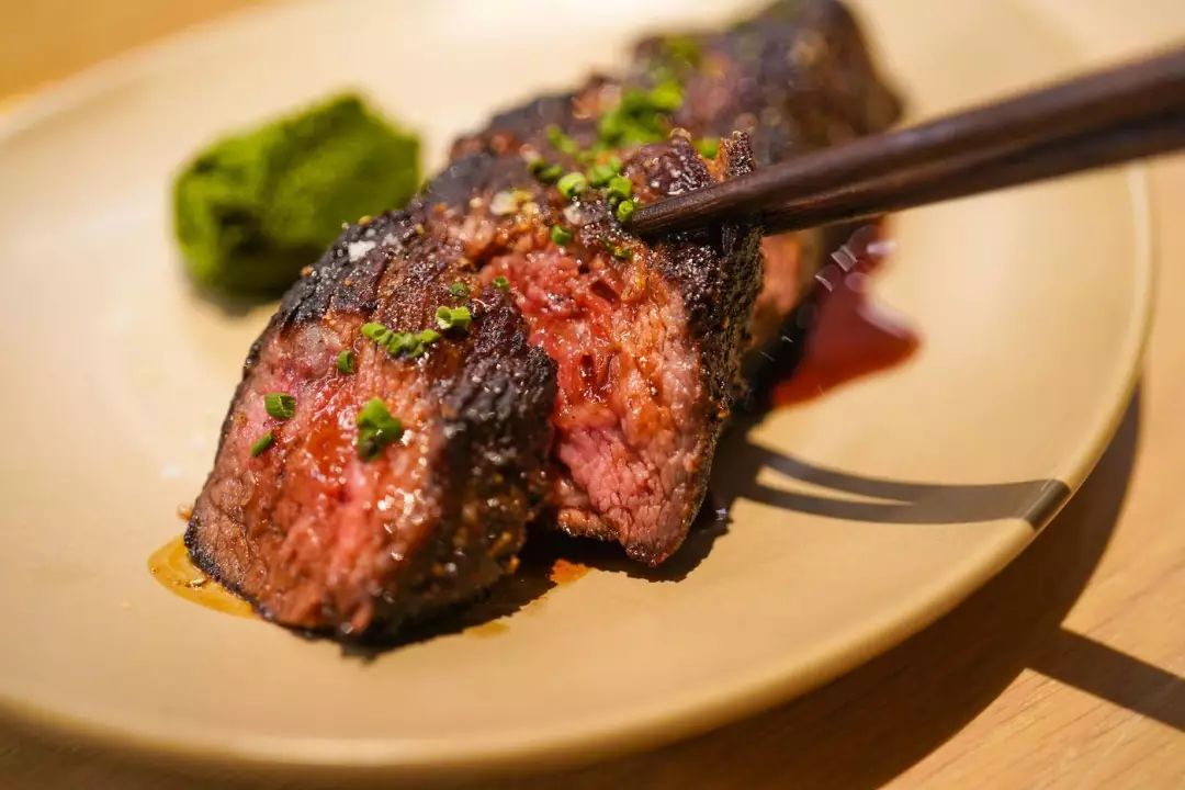 这盘美国牛腹心肉是用米麹腌制过几天的,这是现在料理界的时髦玩法,算是很简易的「熟成」,给牛肉增加风味用。历史嘛很悠久,甜面酱就是这玩意儿发酵的。
