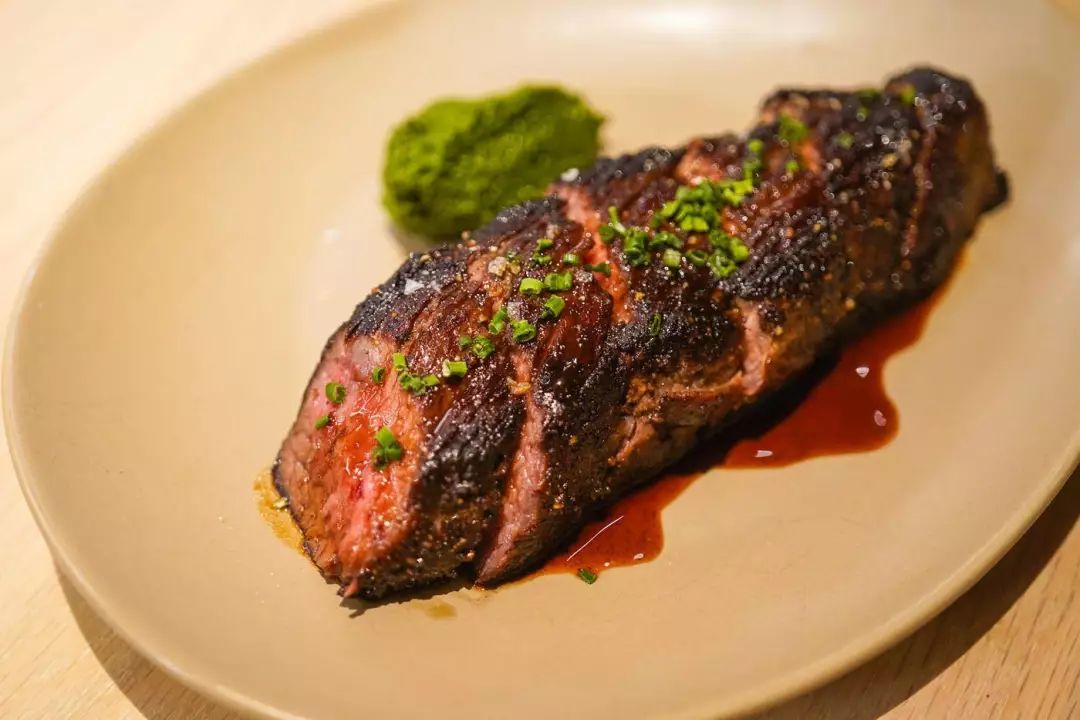 这款腹心肉用的美国牛肉,以米麹菌发酵几天。外皮煎烤焦香,内里柔嫩多汁,非常下酒!