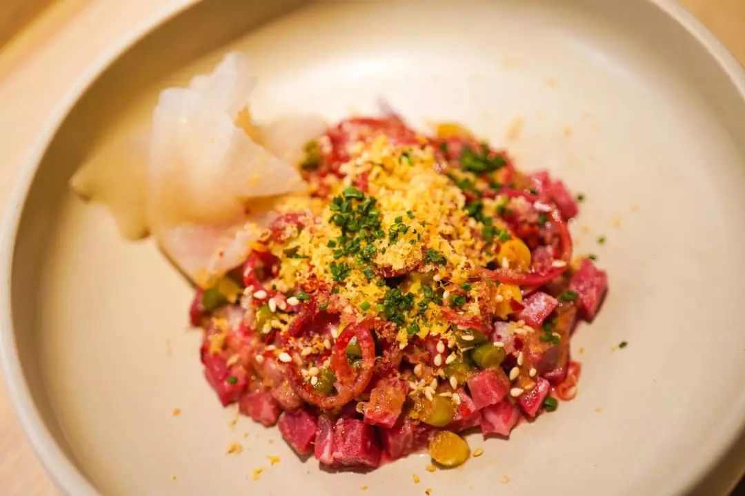 牛肉塔塔里还有微微腌过的薄雪梨片,灵感则取自韩国人的生拌牛肉。
