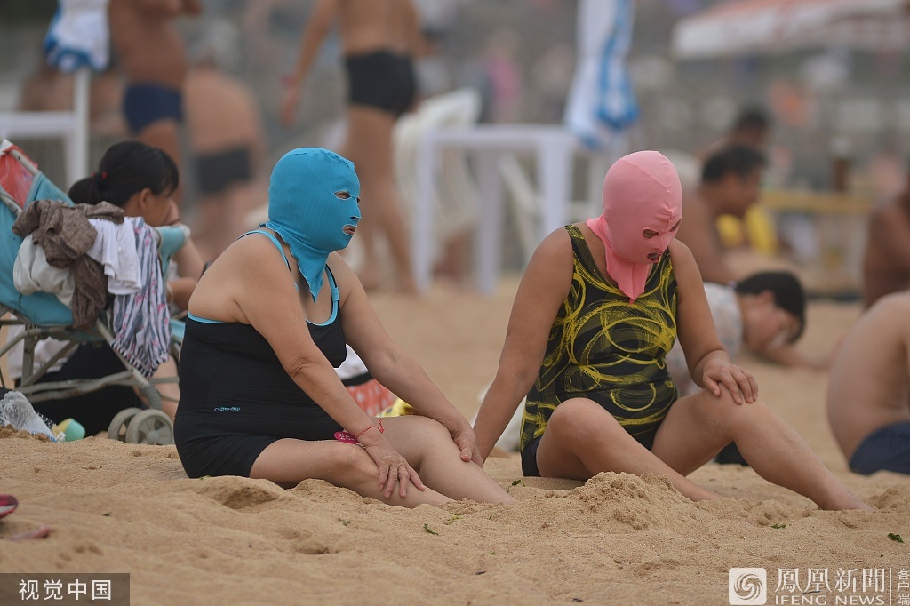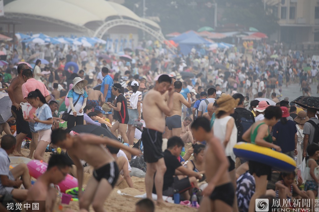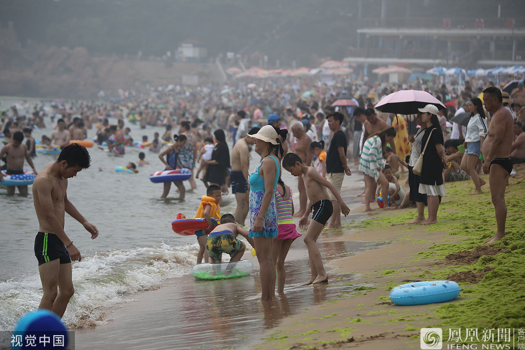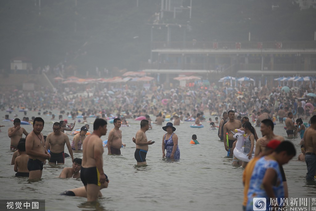 7月13日报道,12日,青岛,游客在第一海水浴场洗海澡。入伏首日市民扎堆洗海澡 “煮饺子”模式再度开启。