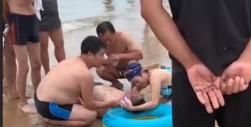 现场视频显示,男子被救上岸后,有人找来游泳圈,垫在了他的头部。沙滩上,留下了大片血迹。在他身旁,一名女子焦急地查看伤情,并试图与他进行交谈