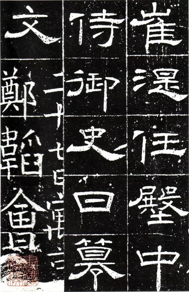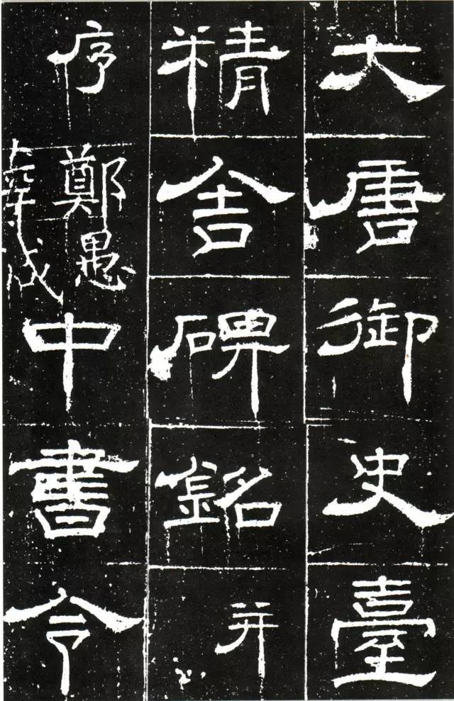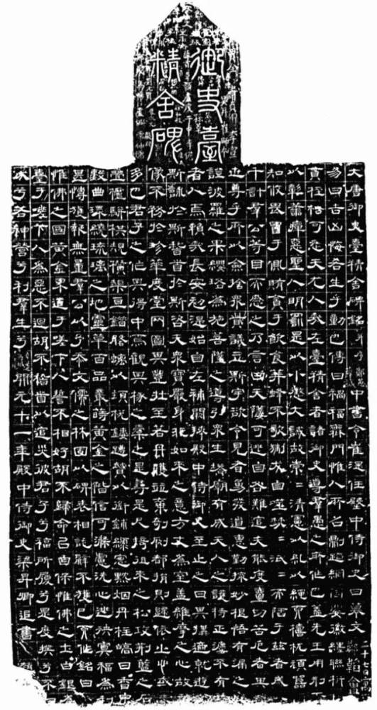 《唐御史台精舍碑》,开元十一年立。螭首方趺,通高185CM,碑身宽64CM,厚14CM,趺宽73CM,趺厚40CM。碑文连题18行,满行30字,崔湜撰文,梁昇卿隶书,赵礼刻。碑阴、侧及额有当时的御史台官员近千人题名。此碑左下角略有残损,现存西安碑林博物馆。