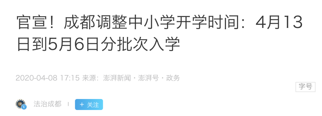 还有成都:成都中小学复课时间原计划为4月13日,但是近日,成都市教育局决定调整中小学开学时间,小学5、6年级建议定于4月27日复学;其他年级建议定于5月6日复学。
