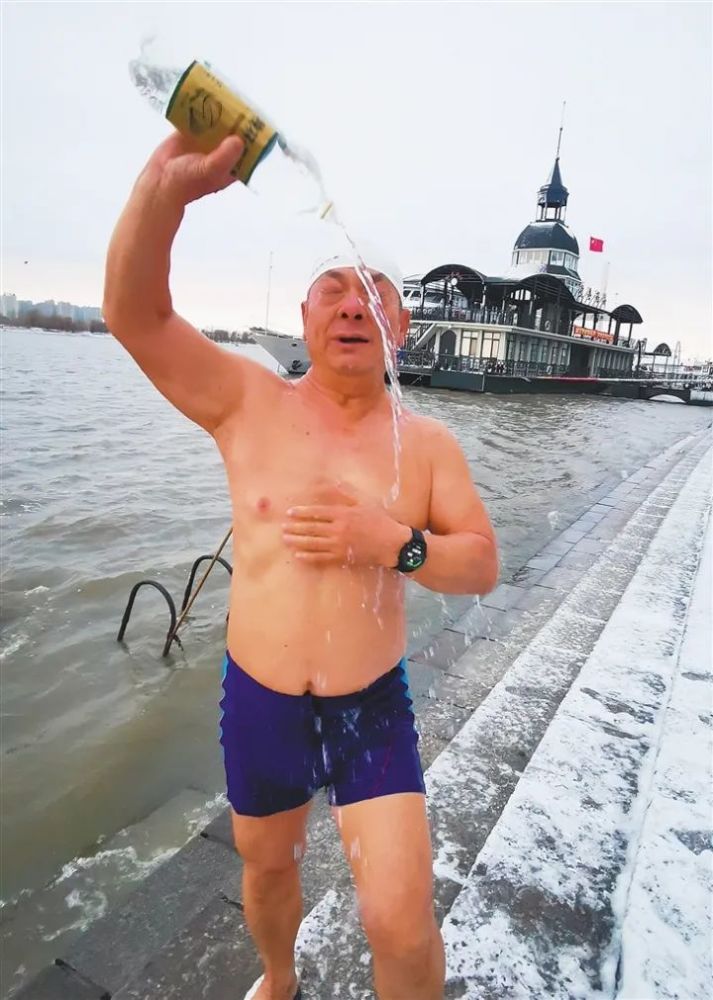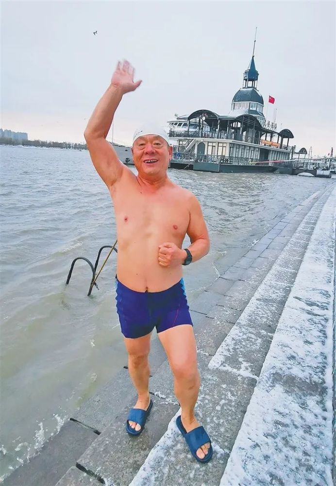 一位50出头的冬泳爱好者刘先生开心地介绍说,这老爷子,可是他们学习的榜样,每到冬季,无论是刮风还是下雪,他几乎是天天来到江边和他们一起冬泳,如今锻炼得比他们这些年轻几十岁的身体还要强壮。