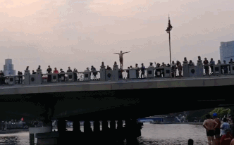 天津的海河边!狮子林桥!一群人正在排着队往下跳!这是天津卫的另一道风景线!