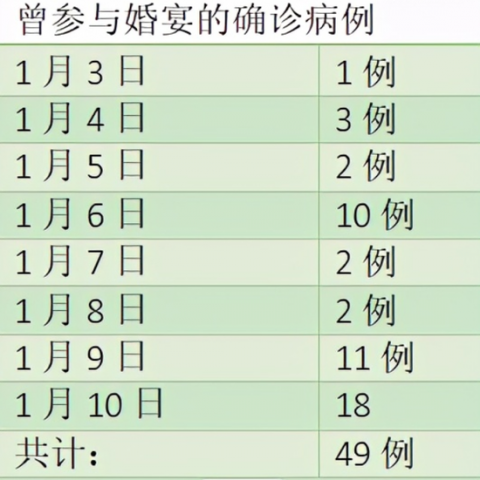 参加婚宴的相关确诊病例有49例。据不完全统计,这些病例涉及到的婚宴场次至少有20场,涉及十余个村庄及街道,呈现聚集性特点。