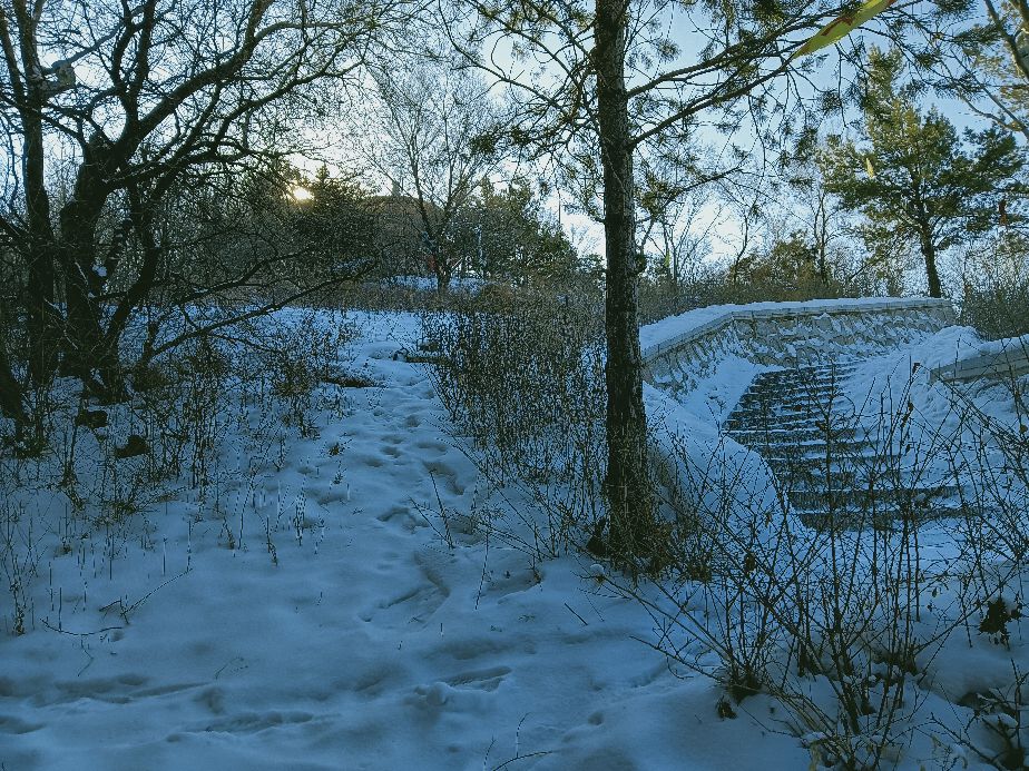 我从山坡上踏着比西山薄许多许多的雪,先登上赏月亭亭,