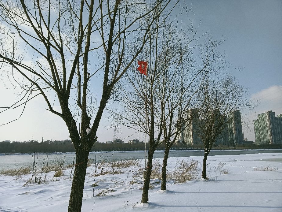 下午我来到新雪厚达十多公分,没有一个人脚印的江滨冬泳基地,先在去江边的路上来回走了两趟,趟趟路。