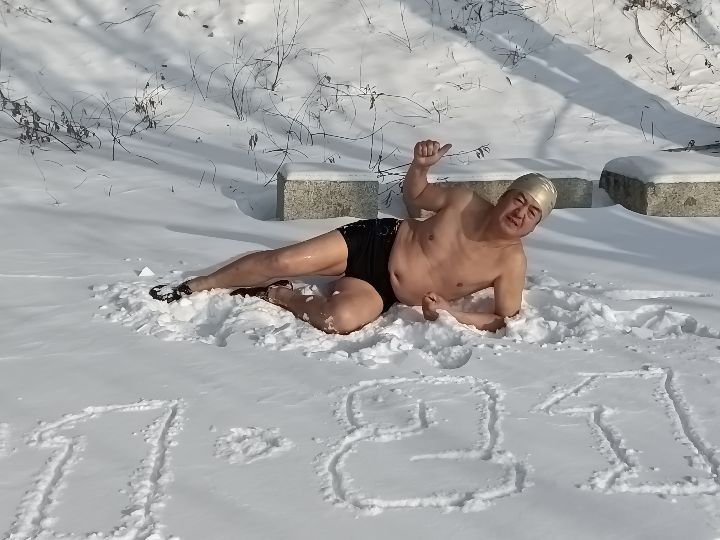 更衣着泳装以后,我右侧卧躺在雪地里摆半天泡斯,可惜他的手机冻的卡壳了 一个照片没有留下。