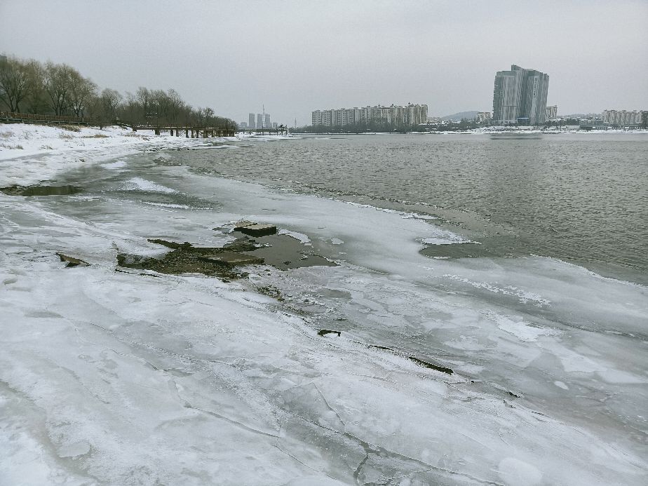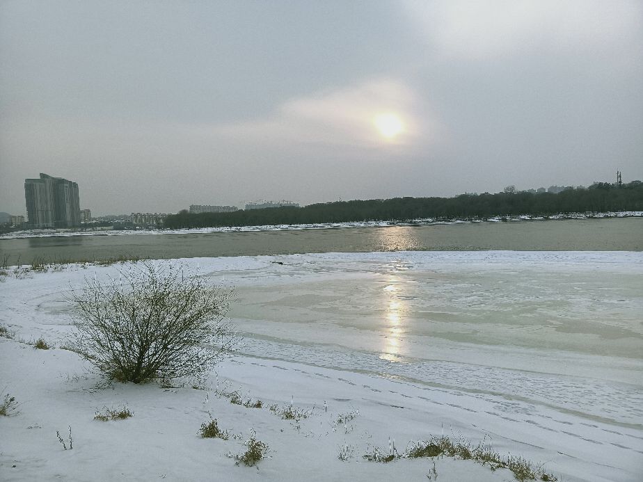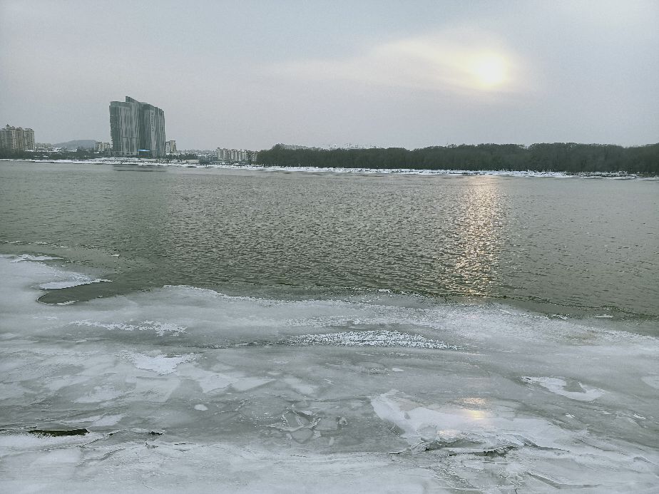 现在天长了许多,今天下午在日暮时分,接近四点了,我才到江滨冬泳基地。先到江边看一下冰情,