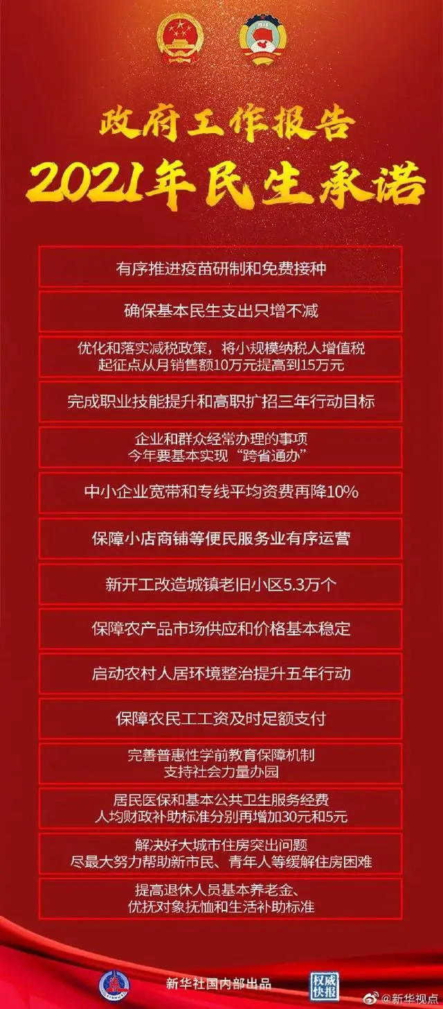 5日提请十三届全国人大四次会议审议的政府工作报告提出,今年要切实增进民生福祉,注重解民忧、纾民困,及时回应群众关切,持续改善人民生活。有序推进疫苗研制和免费接种,新开工改造城镇老旧小区5.3万个,保障农民工工资及时足额支付……这些民生承诺直抵民心。