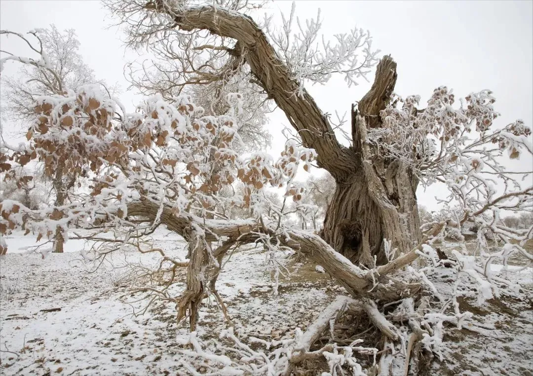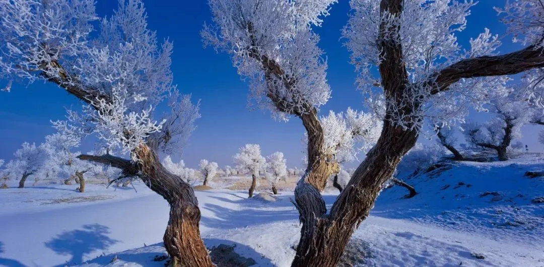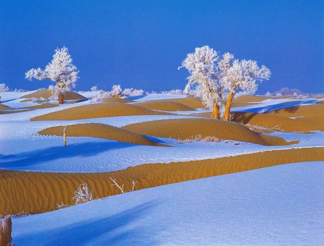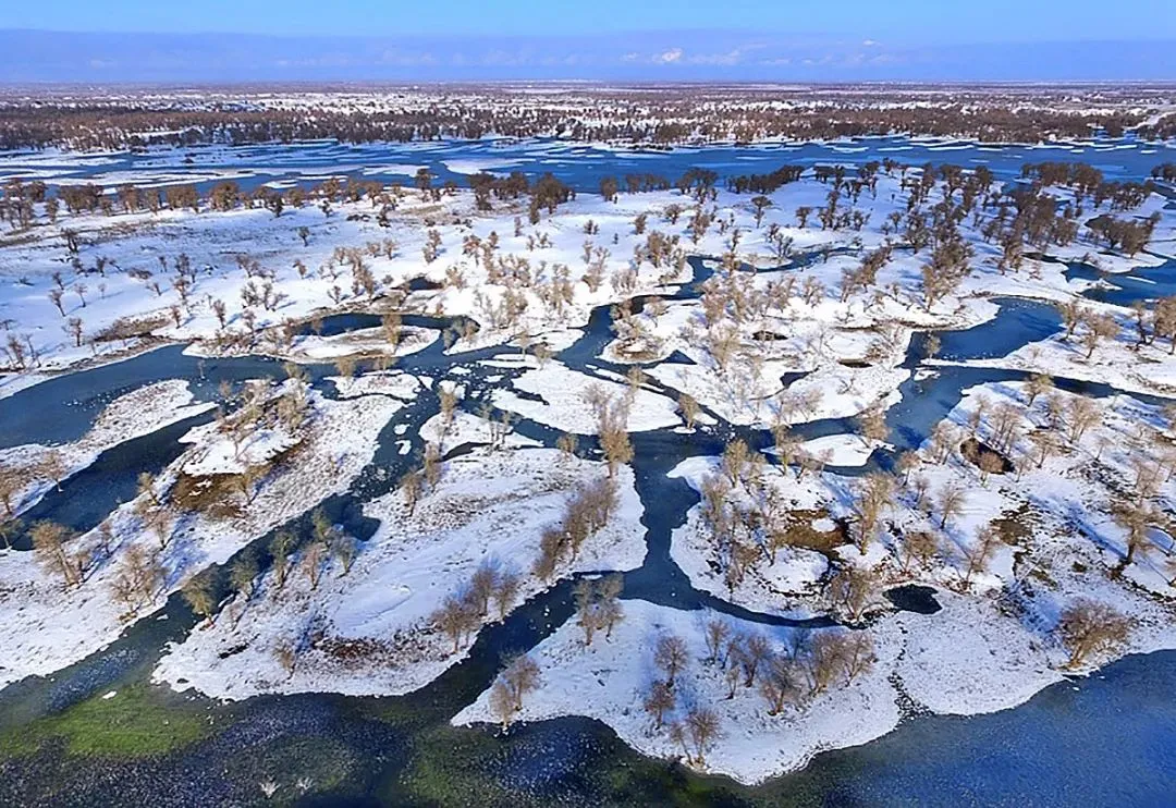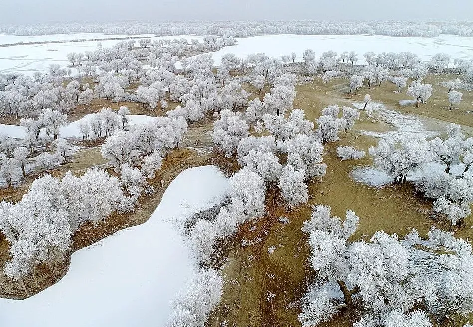 冬日,塔克拉玛干沙漠一场大雪过后,大漠沐雪、胡杨披霜,大雪把地面上的小沟壑、杂草都覆盖住,整个大地银装素裹,似童话世界。瑞雪把沙漠装扮得更加淡雅、简洁;冰雪中的雾凇胡杨,玉树临风,独傲秋霜,与沙漠、河流、湖泊构成了一幅幅北国风光,从空中俯瞰银装素裹的大漠胡杨,独特而震撼,更有惊世之美……
