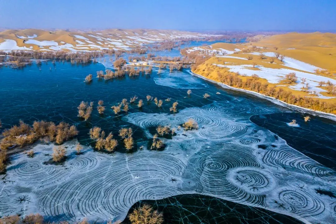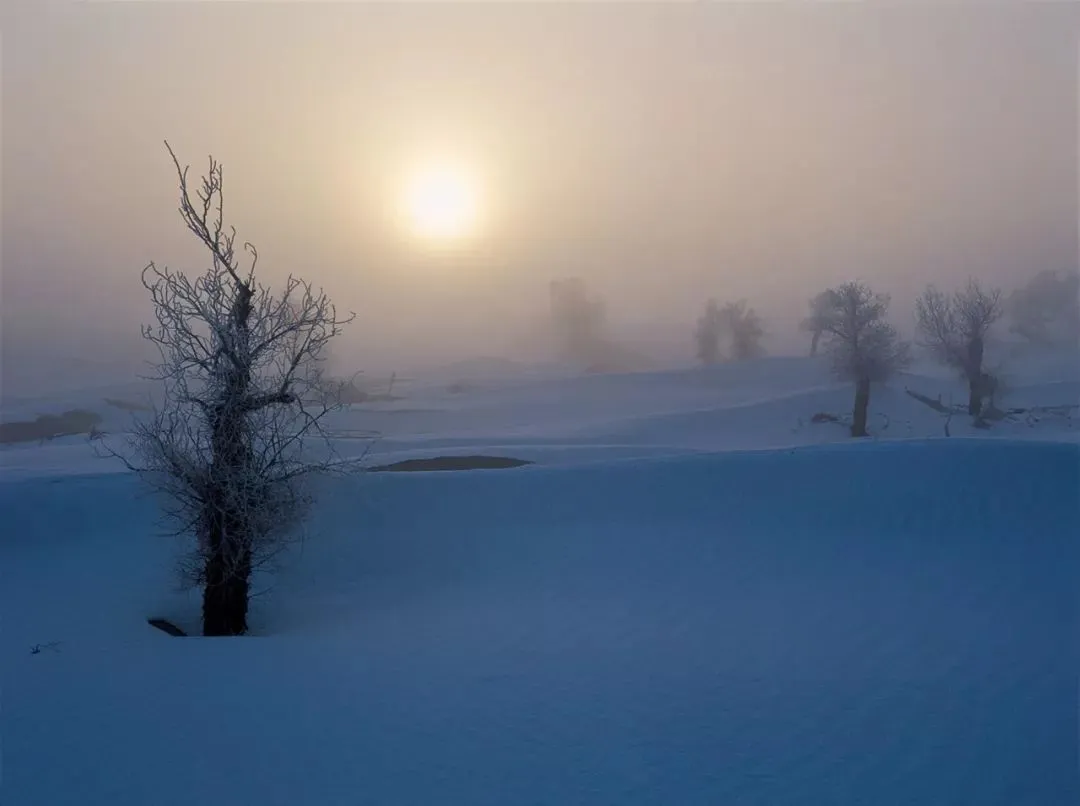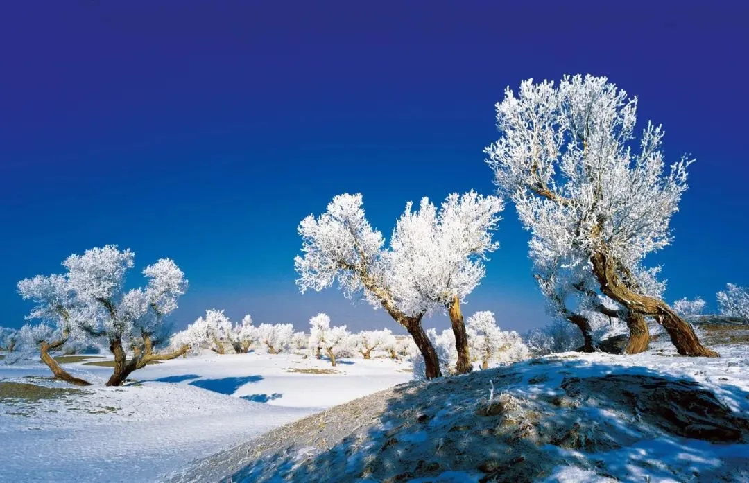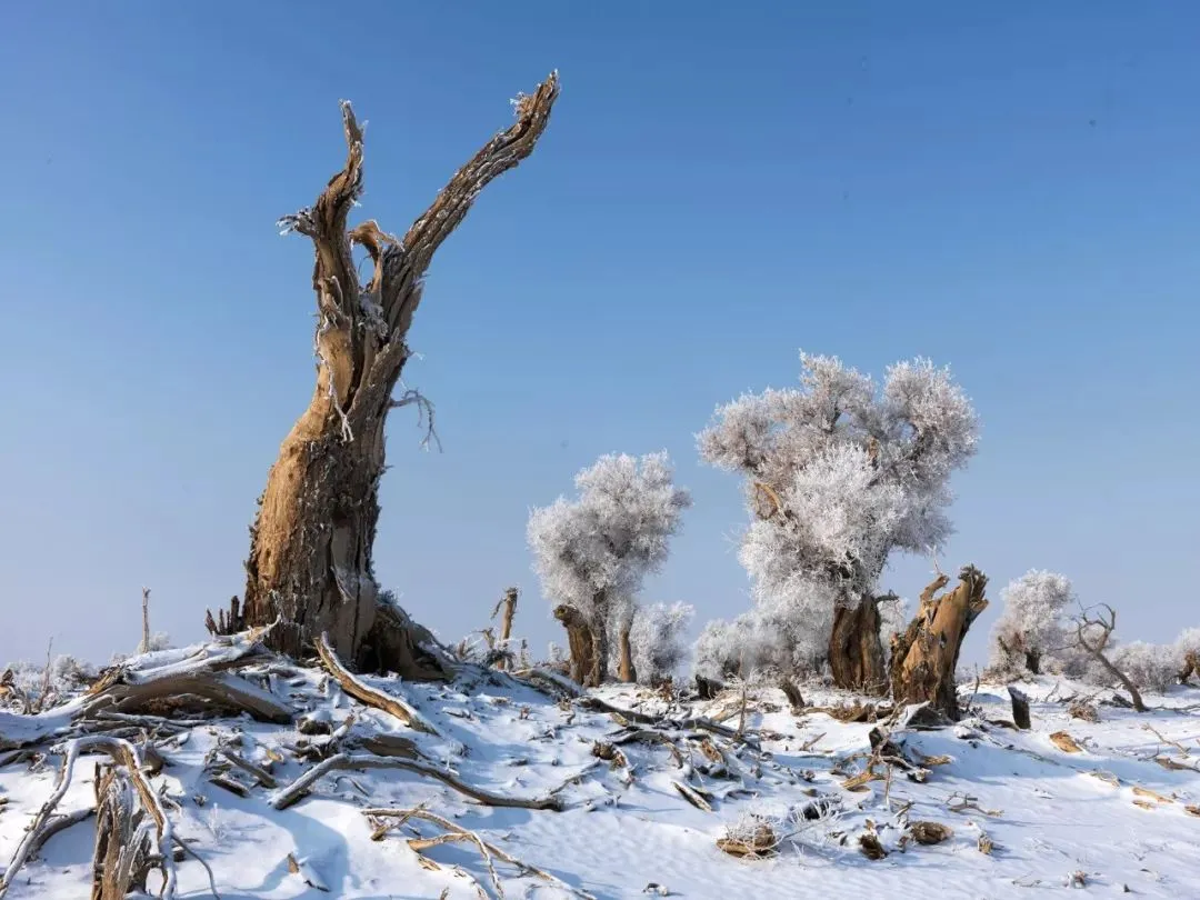 冬日,塔克拉玛干沙漠一场大雪过后,大漠沐雪、胡杨披霜,大雪把地面上的小沟壑、杂草都覆盖住,整个大地银装素裹,似童话世界。瑞雪把沙漠装扮得更加淡雅、简洁;冰雪中的雾凇胡杨,玉树临风,独傲秋霜,与沙漠、河流、湖泊构成了一幅幅北国风光,从空中俯瞰银装素裹的大漠胡杨,独特而震撼,更有惊世之美……