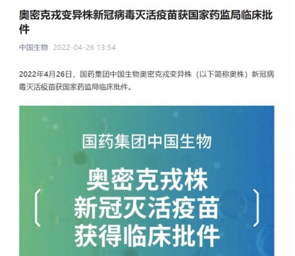 2、今天4月26日,中国生物北京生物制品研究所奥密克戎变异株新冠病毒灭活疫苗获得了中国国家药监局颁发的临床批件。