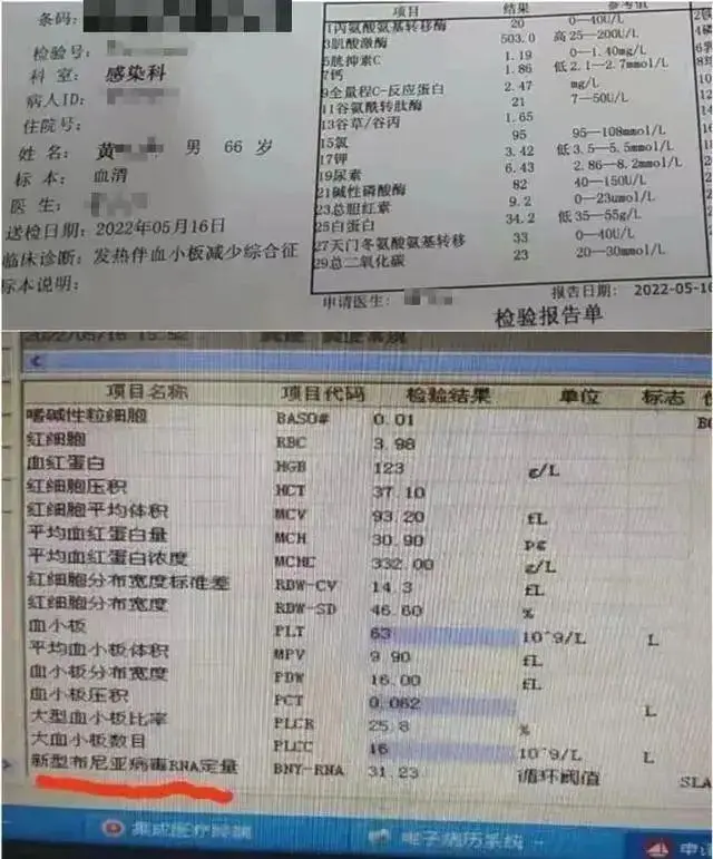 5月15日,黄骅被送入信阳990医院就诊,经多项检查后,确诊为 “发热伴血小板综合征”,病情严重。