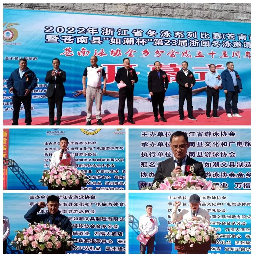 金乡镇有关领导在开幕式上致欢迎词,开幕式上还进行运动员、裁判员宣誓仪式,省市领导给活动冠名商及苍南县游泳协会金乡分会授牌。