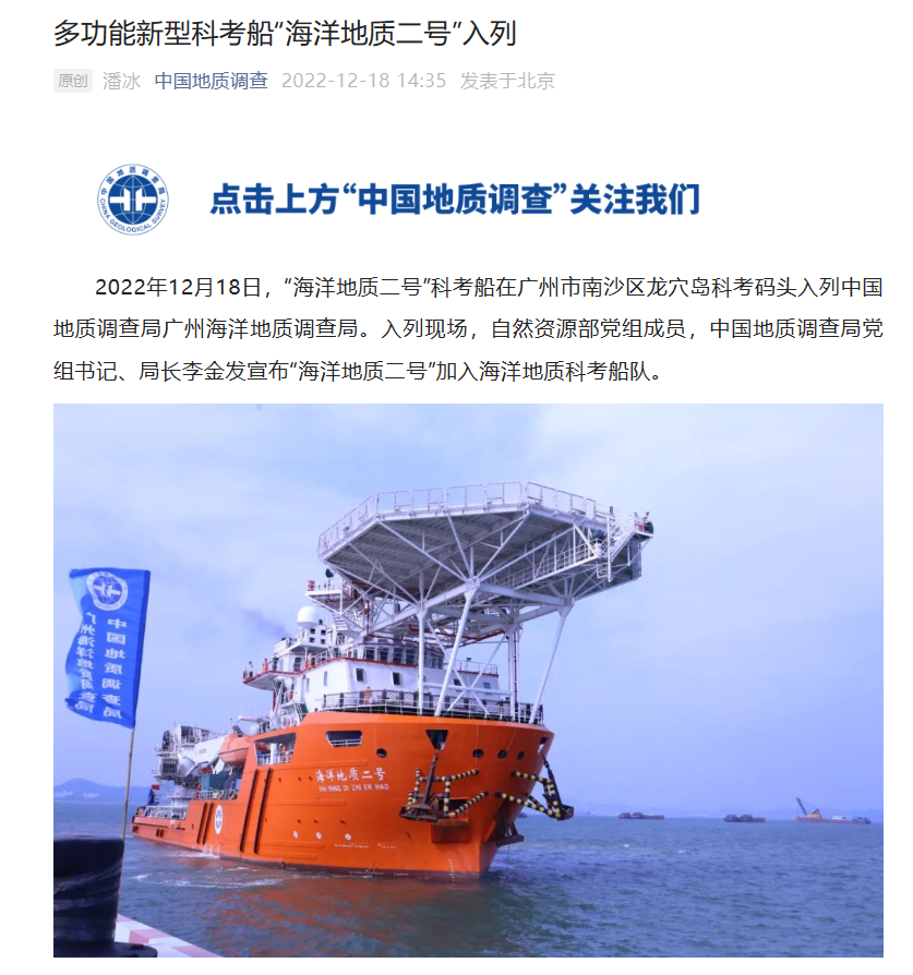 同日,“海洋地质二号”多功能新型科考船缓缓抵靠中国地质调查局广州海洋地质调查局科考码头,标志着我国首座深水科考码头,也是国内规模最大的科考专用码头正式启用,我国深海探测基地保障能力进一步提升。