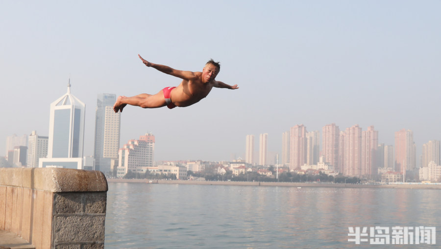 邓宗平今年64岁,具有30年的冬泳历史,经验丰富,号称《大飞燕》,跳水多少年,成为栈桥一景,让人们欣赏美感。