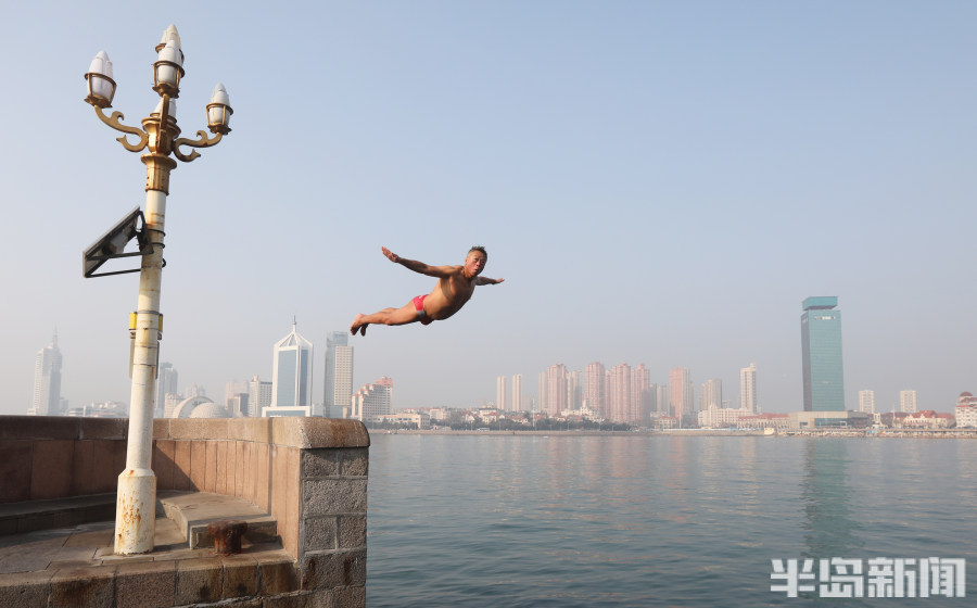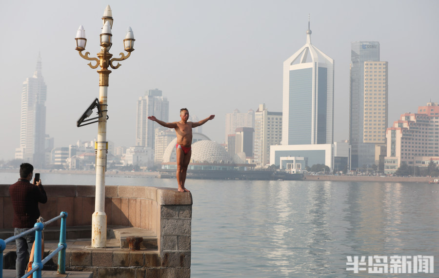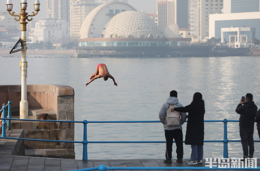 2022年12月31日,青岛栈桥回澜阁旁,青岛冬泳界的老将邓宗平像往常一样在这里跳水“飞燕”。虽然户外温度仅零下三四摄氏度,但是依旧挡不住这些热爱冬泳“健将”下海的热情。每次跳完,一旁的游客就会给他叫好,并送上掌声,给他加油鼓劲。