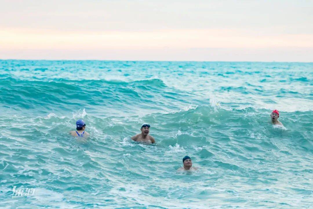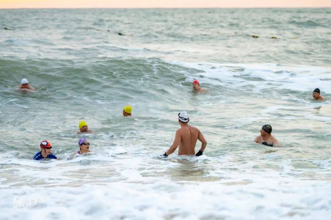 清晨的海滩,霞光映红天际, 气温-1℃,海水温度3℃左右。冬泳爱好者们充分做好准备活动后,纷纷下水,在碧水蓝天中畅游,迎接春天的到来。