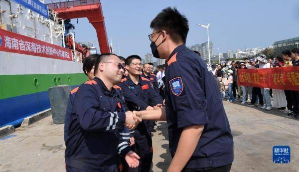3月11日,“探索一号”科考船携“奋斗者”号全海深载人潜水器抵达三亚,参与科考任务的科学家与前来欢迎的人们握手。新华社记者 陈凯姿 摄