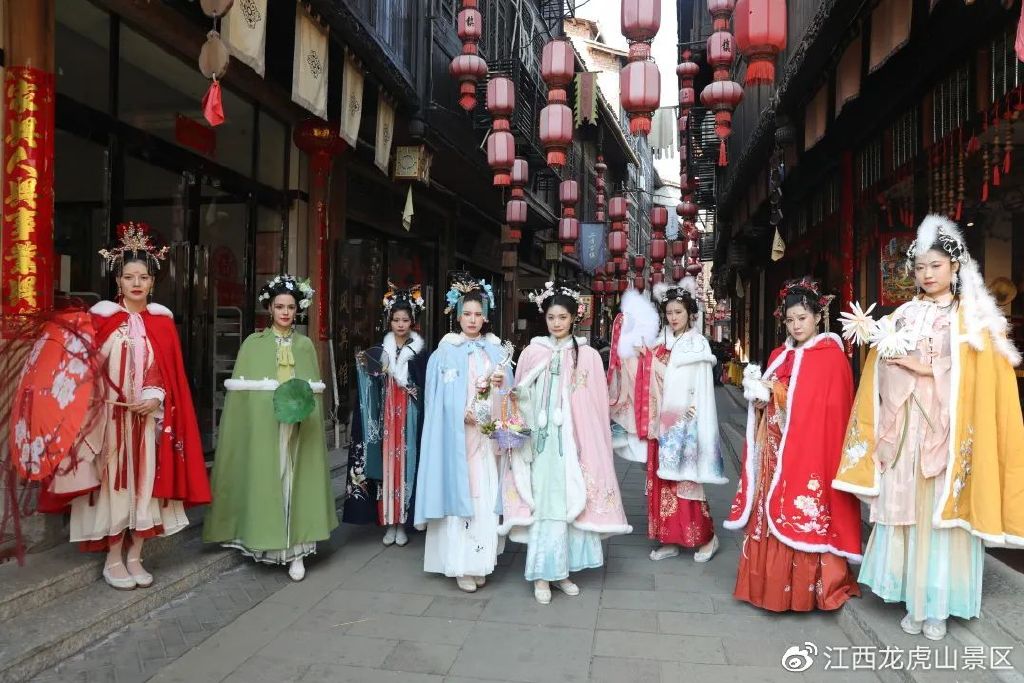 古镇古色古香,漂亮的汉服在街上靓丽,古色长龙在水中游荡,画面甚是好看。