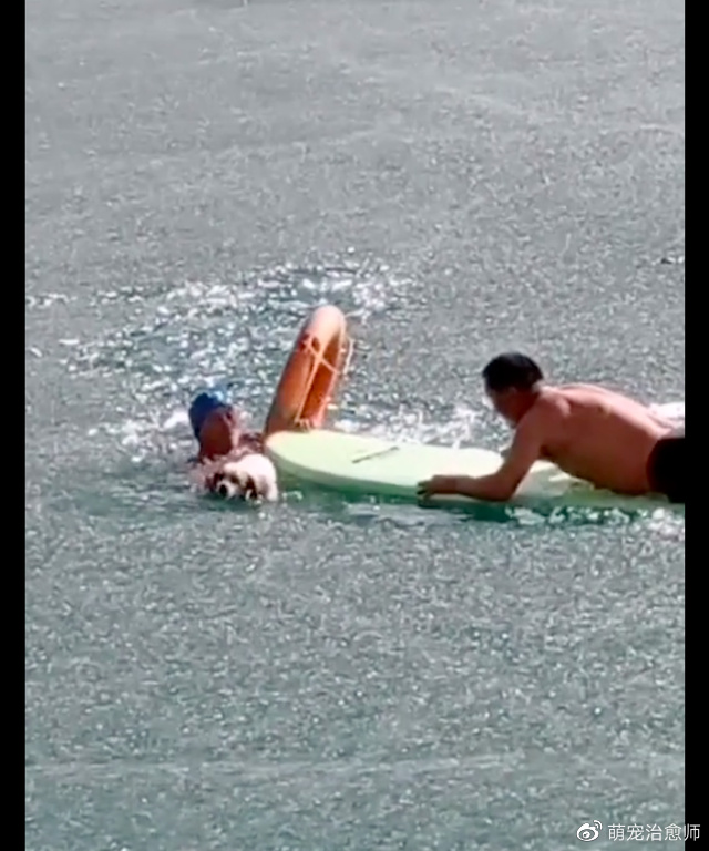 就这样很快其中一位男子接近到了狗狗,然后将它从水里给推举起来,然后另一名男子赶来,一起将狗狗放在了板子上面,然后大家在一起推着板子回到了岸边来!狗狗仿佛知道大家在救它,所以趴在上面一动不动的!真是感谢这些好心人啊!要不然后果不堪设想!没人知道狗狗是怎么掉进去了,可能是贪玩踩在冰面上玩,但是白天冰面碎了就掉进去了,以后要小心啊,不要再去危险的冰面上了!