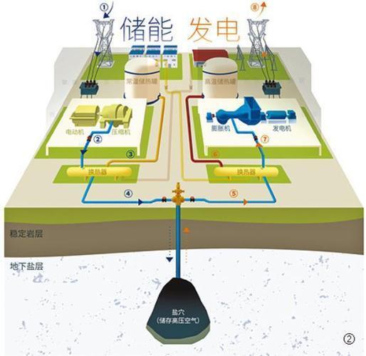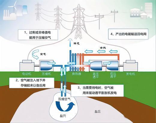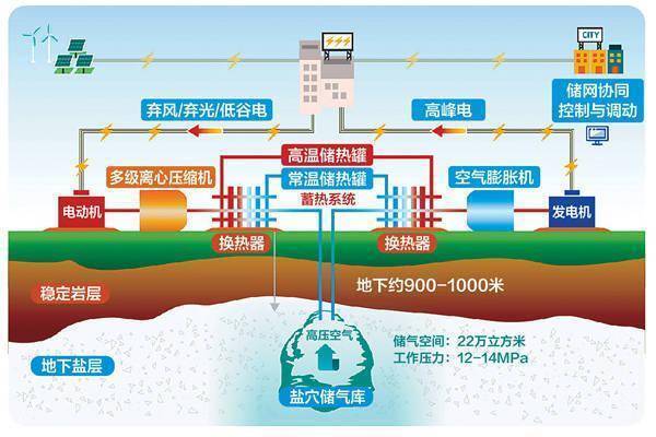 这个项目的特点是利用了金坛地区丰富的盐穴资源,将空气压缩到地下1000米深的盐穴中,形成了一个巨大的“空气充电宝”。在用电低谷时,利用风力发电机组将风能转化为电能,并将多余的电力用于压缩空气;在用电高峰时,再将存储在盐穴中的高压空气释放出来,通过透平机组发电,并与太阳能光伏发电相结合。这样既可以提高风力和太阳能的利用率,又可以降低对火力发电的依赖。