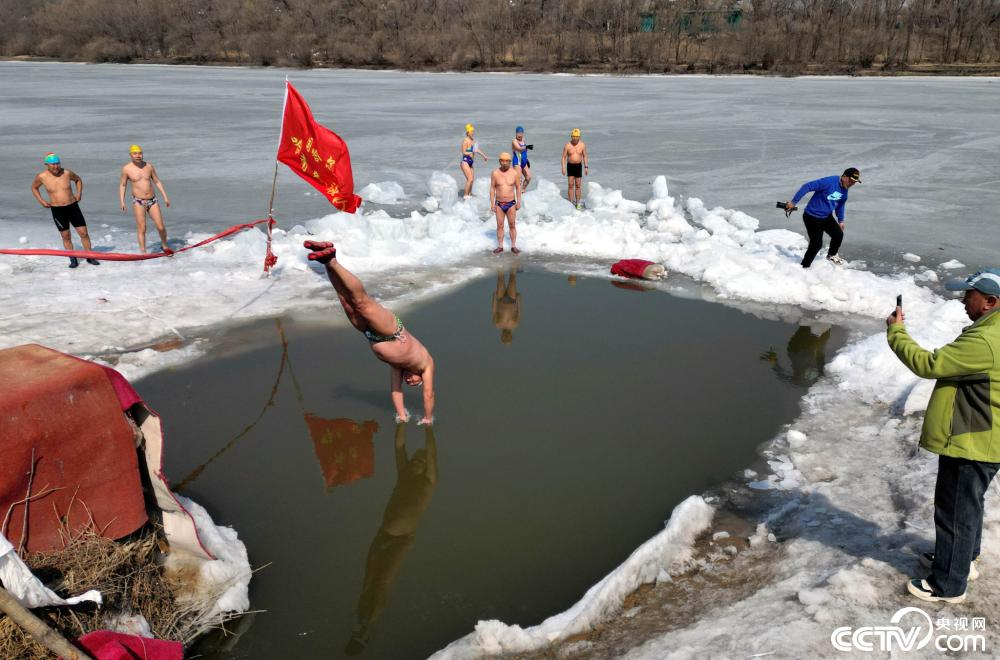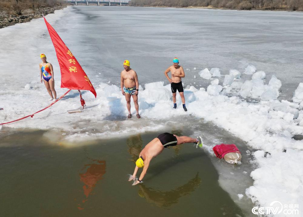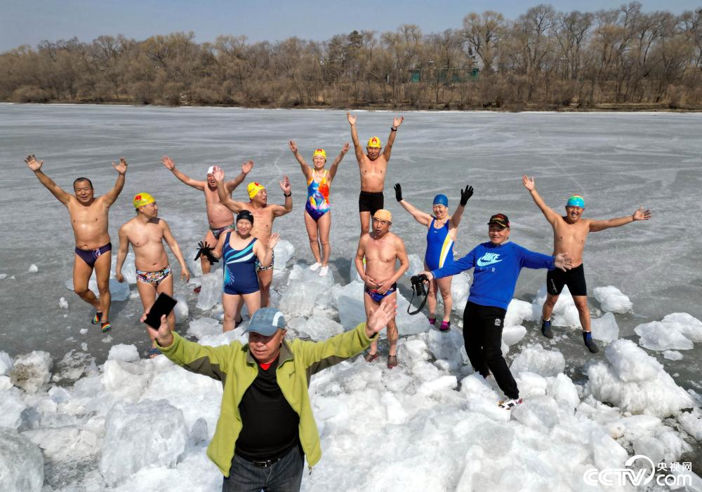 哈尔滨松花江段开江,冬泳人喜笑颜开,下水游泳庆祝。