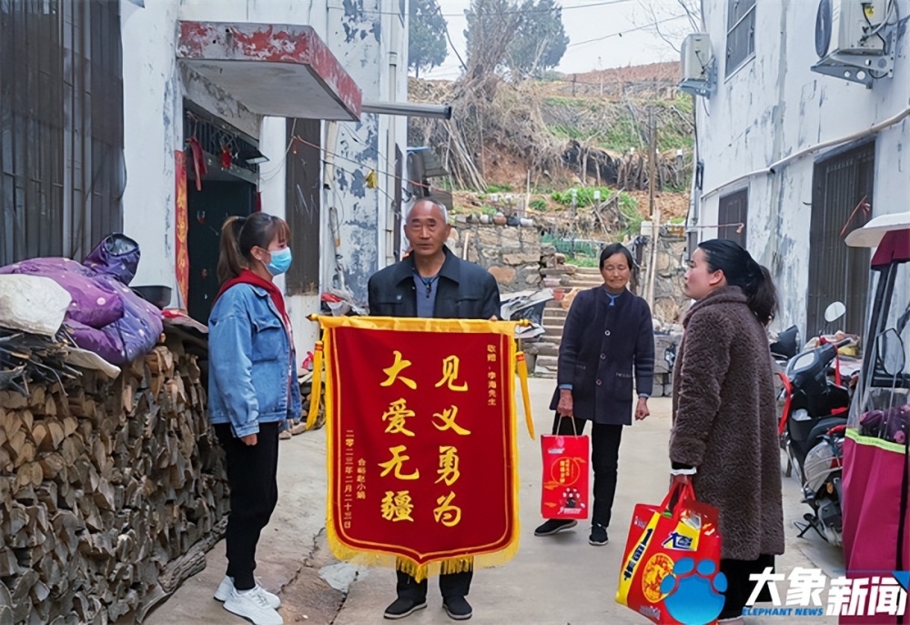 “我是经过几天打听,问了好多人,才找到救我孩子的恩人李海,身边的好人还是多。”孩子母亲赵小娟提到给了孩子第二次生命的李海的义举,忍不住热泪盈眶。3月23日,找到救命恩人李海后,赵小娟将一面写有“见义勇为 大爱无疆”的锦旗送到李海老人家中,表达对老人的感激之情。