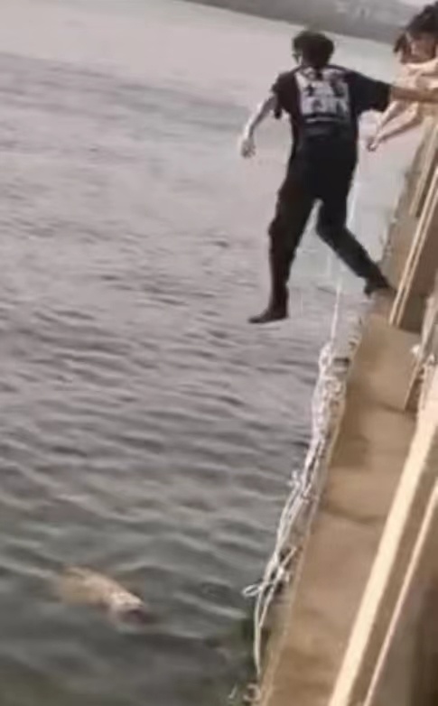 女子溺水漂浮在江面,26岁的游客贺益翻越护栏,准备跳水救人。 均为网友供图