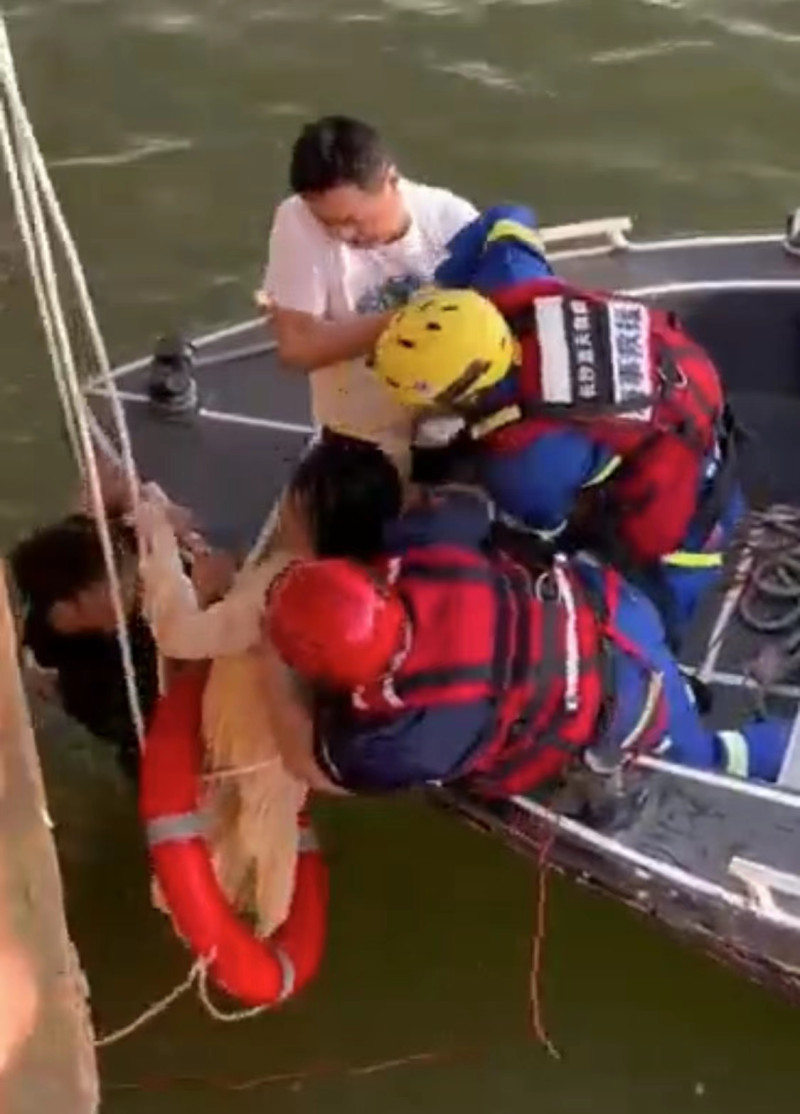民警曹元煜(白衣男子)与蓝天救援队队员驾艇赶来,将女子及贺益拉上快艇。