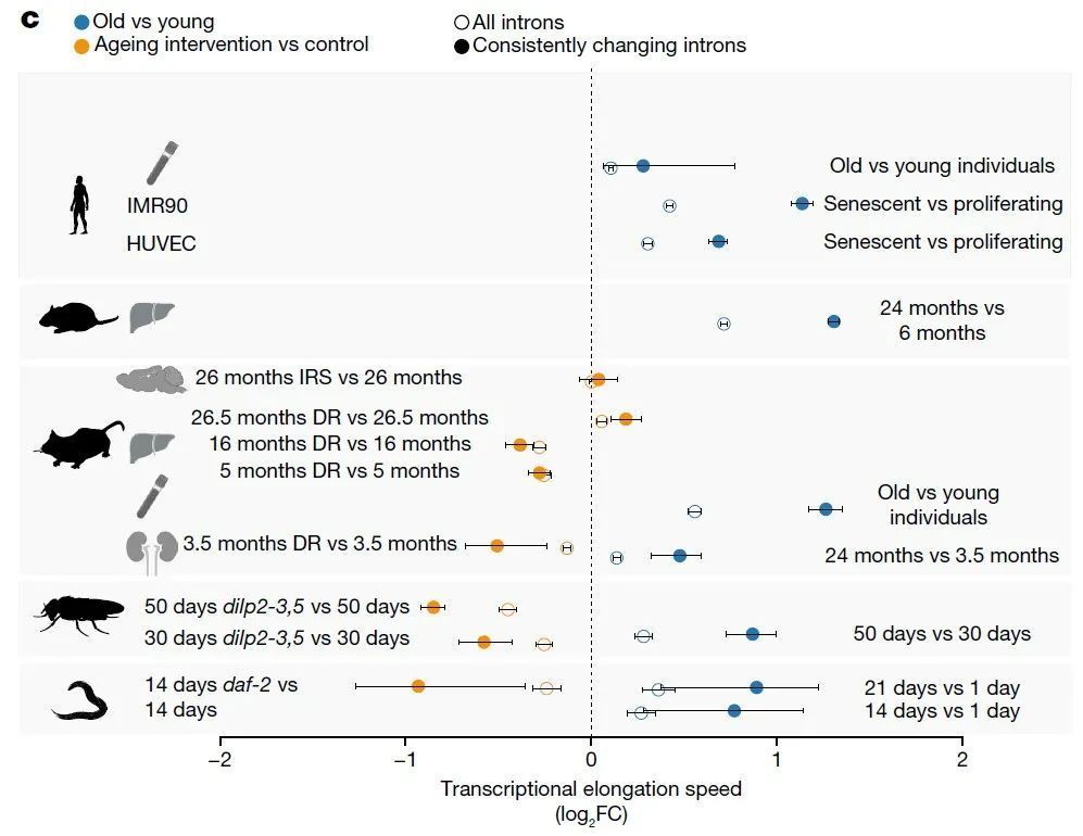 不过幸好,这项研究带来的可不全是坏消息。限制饮食中的能量摄入、抑制胰岛素信号传导,在以往的研究中是两类常见的延寿干预手段。这项研究分析了这些策略对转录延伸速度的影响。在线虫、小鼠和果蝇实验中,调控胰岛素信号的基因出现突变时,Pol II的移动速度慢了下来;此外在限制能量摄入的小鼠中,Pol II的移动速度也更慢了。