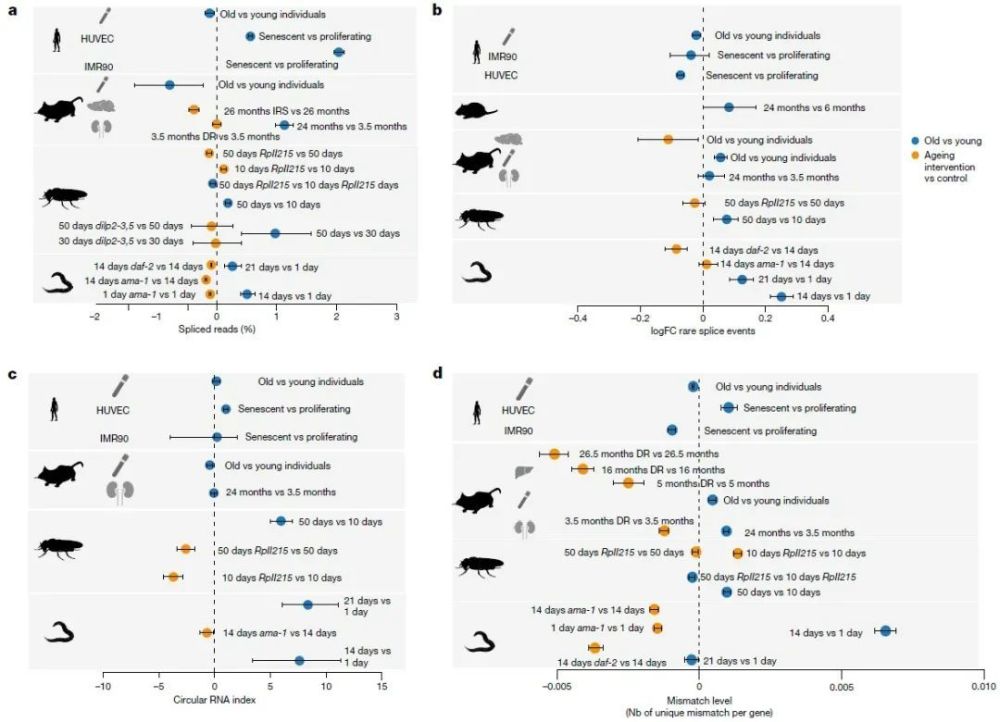 除此之外,研究团队还观察到RNA剪切过程的变化:错误的RNA剪切增多,同时形成了更多的环状RNA,这些变化是转录过程受扰动的标志,并与寿命缩短相关。